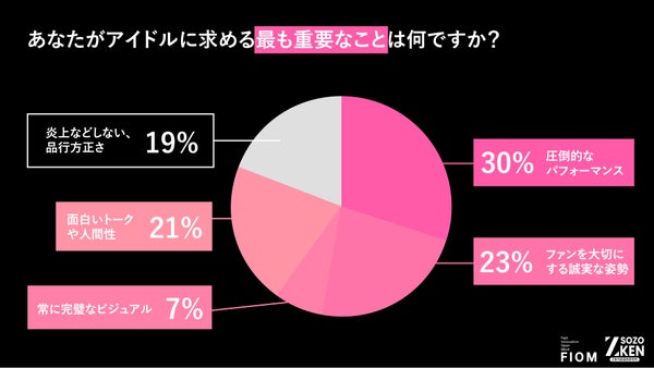 アイドルに求める最も重要なことは「圧倒的なパフォーマンス」(30%) がトップとなりました。「ファンを大切にする誠実な姿勢」(23%)、「面白いトークや人間性」(21%) が続き、「常に完璧なビジュアル」は7%に留まる結果となっています。