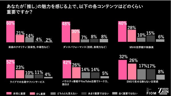 「推し」の魅力を感じる上で重要なコンテンツを尋ねたところ、「楽曲のクオリティ」(「非常に重要」60%、「少し重要」21%)が合計81%、「ダンスパフォーマンス」(「非常に重要」48%、「少し重要」30%)が合計78%となり、本質的な実力を示すコンテンツが上位を占める結果となっています。「SNSで見せる飾らない日常感」(合計58%)よりも重視されており、Z世代がアイドルの「本質」を評価していることがわかります。