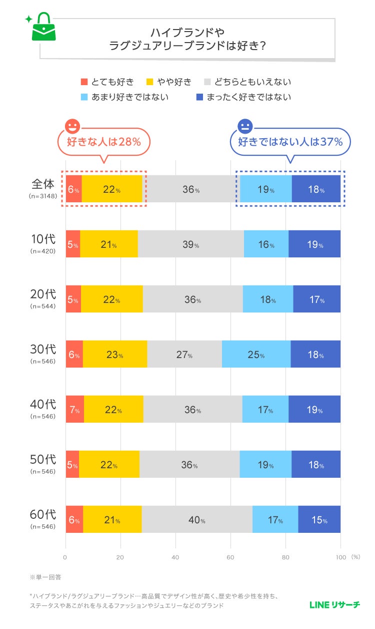 調査によると、ハイブランドやラグジュアリーブランドが好きかどうかについての質問では、全体で最も多かった回答は「どちらともいえない」で3割台半ばとなっています。「とても好き」「やや好き」を合わせた【好き】の割合は3割弱、「あまり好きではない」「まったく好きではない」を合わせた【好きではない】の割合は4割弱という結果でした。