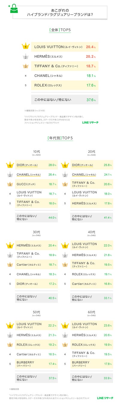 【調査結果】あこがれのハイブランド・ラグジュアリーブランドランキング、全世代TOP2は「ルイ・ヴィトン」「エルメス」に
