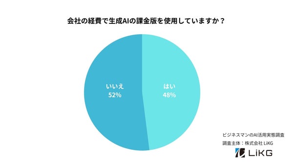 「会社の経費で生成AIの課金版を使用していますか?」という質問に対しては、「使用している」と回答した人が48%、「無料版のみ利用している」が52%と、ほぼ半数に分かれる結果となりました。企業レベルでもAI活用の環境整備が進みつつあるものの、導入支援や費用負担については社内での温度差がまだあることが示唆されています。