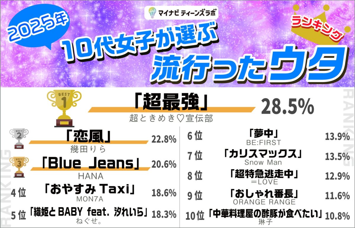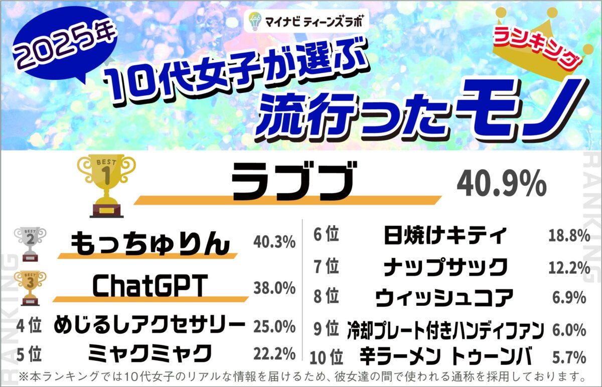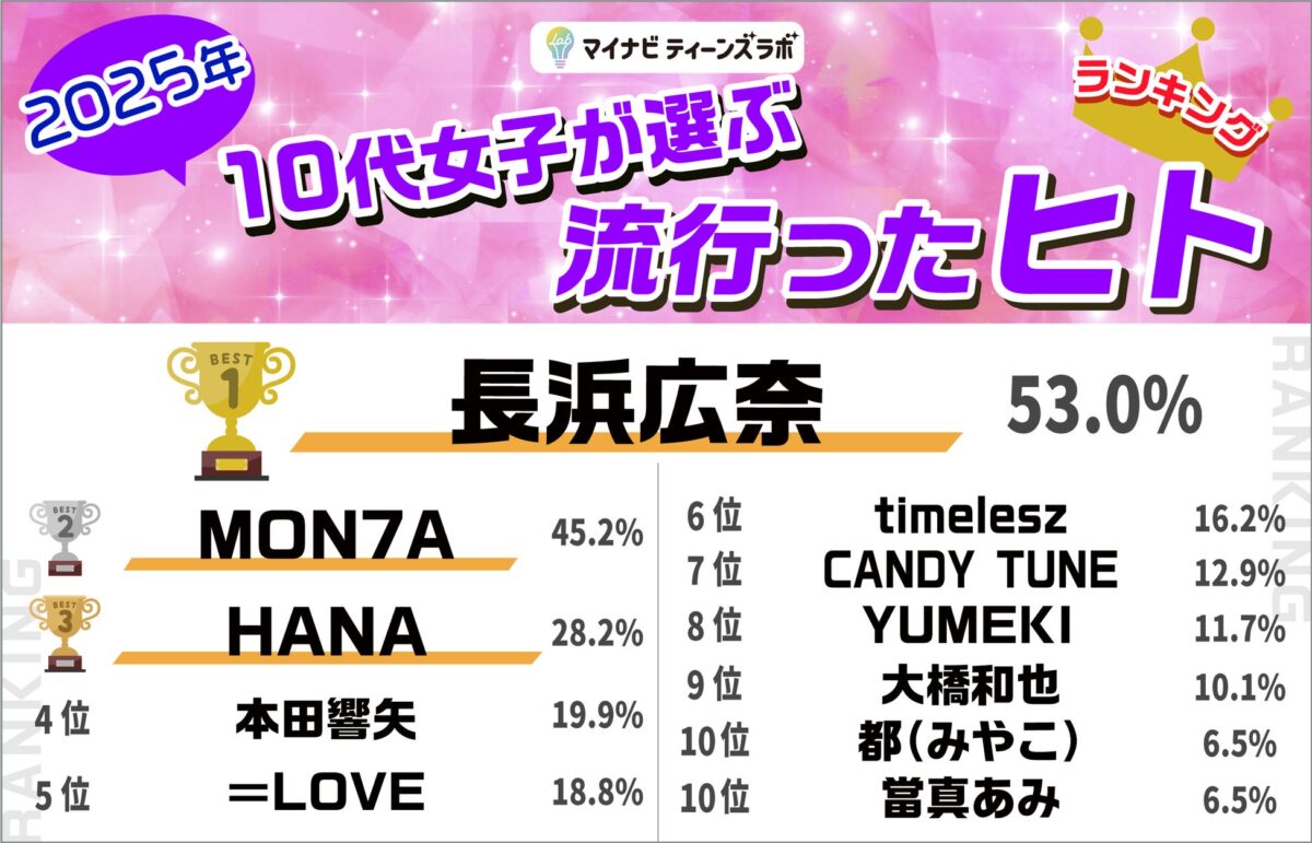 株式会社マイナビが運営する「マイナビティーンズラボ」が、10代女性を対象に実施した「2025年10代女子が選ぶトレンドランキング」の結果を発表しました。このランキングは、2025年に流行した「ヒト・コト・モノ・コトバ・ウタ」の5つのジャンルについて、13歳から19歳までの女性613名から回答を得て集計されたものです。2015年から始まったこの調査は、今年で11年目を迎えています。