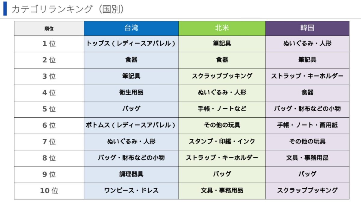 人気商品ランキング(国別)では各国共通で「食器」と「筆記具」が上位にランクイン