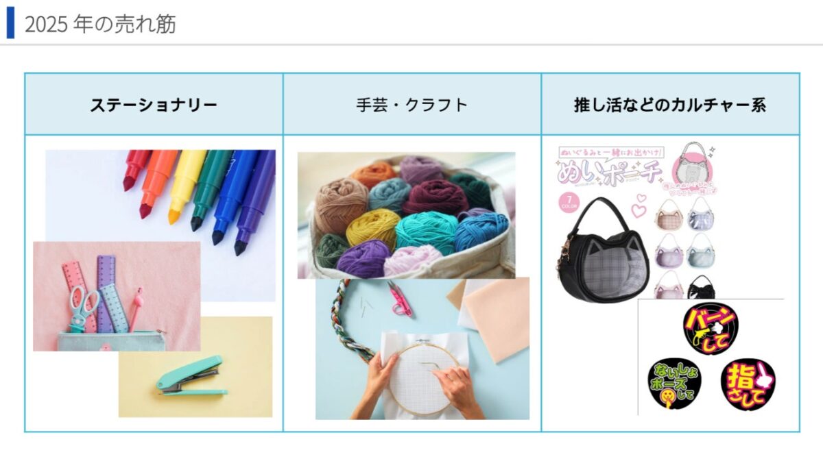 SD exportでは、「ステーショナリー」「手芸クラフト」「推し活などカルチャー系商品」の3ジャンルに特に注目が集まっています。ステーショナリー部門では、高機能な筆記具に加えて、「シール」や「マスキングテープ」といった、手帳やノートを装飾するデザイン性の高いアイテムの需要も増加しています。手芸クラフト部門では、会員購入者数が前年比で13.6%増加し、売上も7.6%増となっており、好調に成長しています。「デニムリペア」に起因する日本の「刺し子(SASHIKO)」ブームや「SNS発のブーケブランケット」の流行により、「糸・毛糸」カテゴリは前年比で52.4%増を記録しました。SNSのトレンドが実販に直結している事象が確認されています。