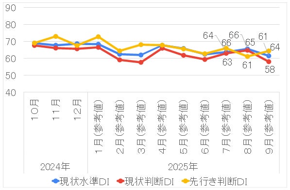 現状水準DIは前四半期と比較して1ポイント減少の64となり、ほぼ横ばいの状態が続いています。また、現状判断DIは前四半期から変動なく62ポイントを維持しており、こちらも横ばい傾向を示しています。