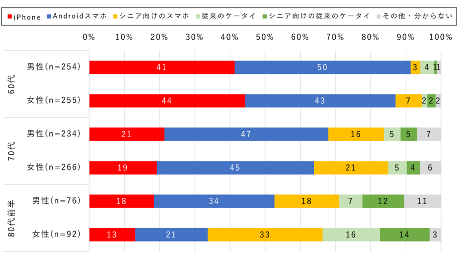 実はシニア向けスマホは60代にはほとんど使われなくなっており、9割はiPhoneまたはAndroidの一般的なスマホを利用しています。70代でも3分の2は普通のスマホを使っています。