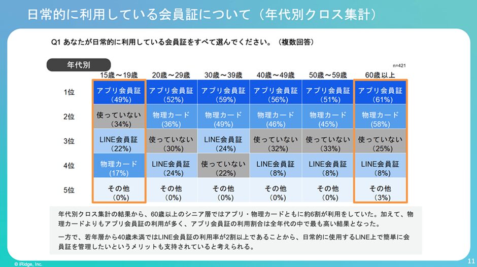 複数回答ありのアンケートなので併用が多いことも考慮する必要がありますが、実はアプリ会員証を最も多く使っているのは60歳以上のシニアなのです。
