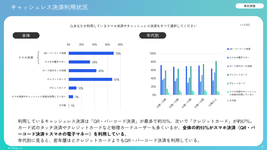 これも弊社が2025年に行った調査データですが、スマホアプリを使わないと利用できないQR・バーコード決済の利用率は年代別であまり差がなく、シニア層でも6割以上が利用しています。