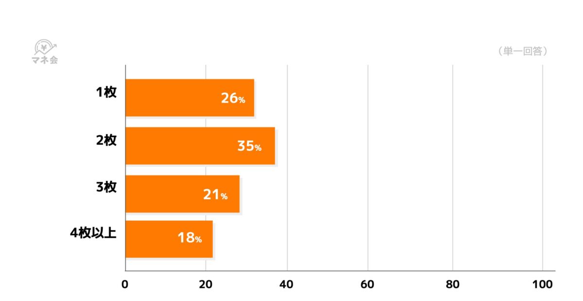 また、保有しているカードの枚数は「2枚」35%、「3枚」21%、「4枚以上」18%で、2枚以上のカードを使い分ける方が半数以上を占めていることがわかります。