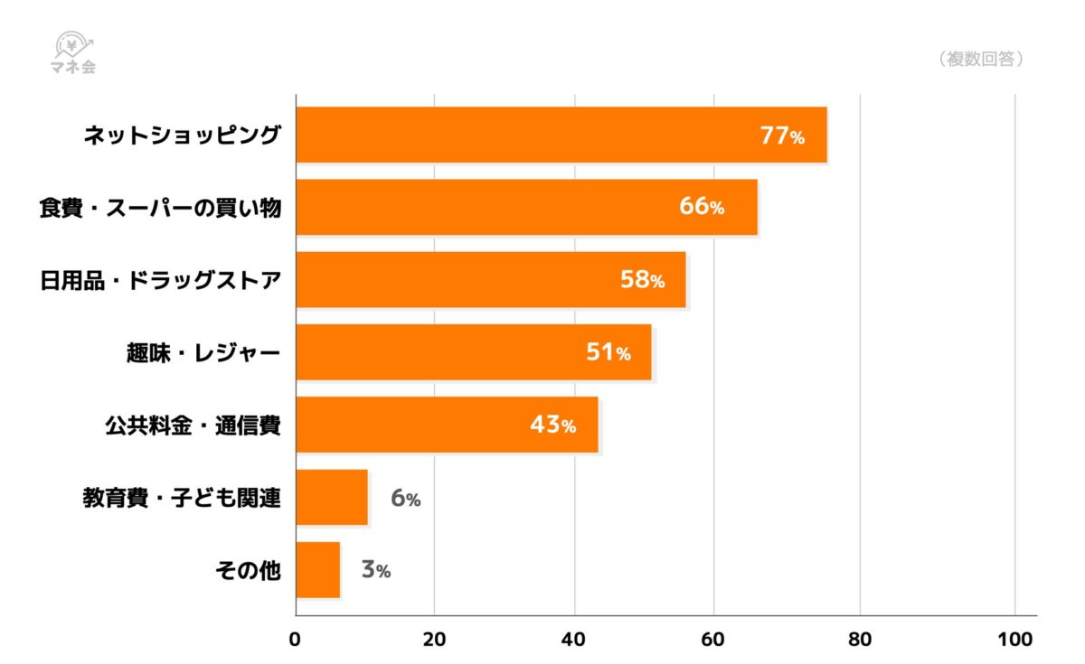 「ネットショッピング」が77%で最も多く、「食費・スーパーでの購入」は66%、「日用品・ドラッグストア」での支払いは58%と続いています。