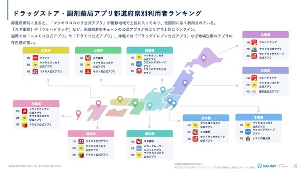 地域別の特徴としては、福岡では「コスモス公式アプリ」や「ドラモリ公式アプリ」、沖縄では「ドラッグイレブン公式アプリ」など地場企業のアプリの存在感が際立っています。