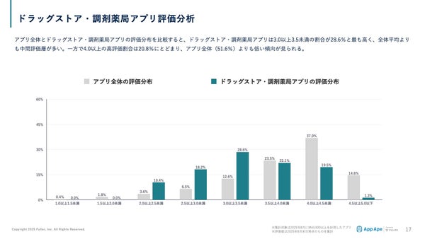 アプリ全体とドラッグストア・調剤薬局アプリの評価分布を比較すると、ドラッグストア・調剤薬局アプリは3.0以上3.5未満の割合が28.6%と最も高く、全体平均よりも中間評価層が多いことが確認されています。一方で4.0以上の高評価割合は20.8%にとどまり、アプリ全体(51.6%)よりも低い傾向が明らかになりました。