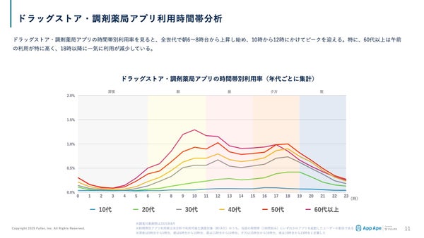 ドラッグストア・調剤薬局アプリの時間帯別利用率を見ると、全世代で朝6〜8時台から利用率が上昇し始め、10時から12時にかけてピークを迎える傾向が示されています。特に60代以上のユーザーは午前の利用率が高く、18時以降に一気に利用が減少するという特徴が見られます。