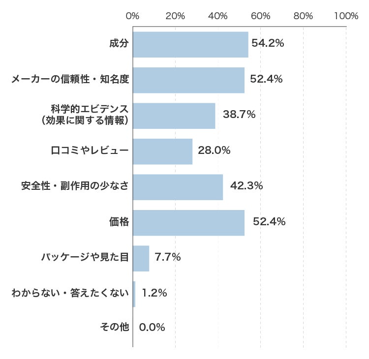 サプリメントを選ぶ際に重視するポイントとしては、「成分」「メーカーへの信頼」「価格」がそれぞれ半数以上の回答を集めました。一方で口コミやレビューを重視するという回答は比較的少なく、これらの情報源への信頼度の低さが要因かもしれないと分析されています。