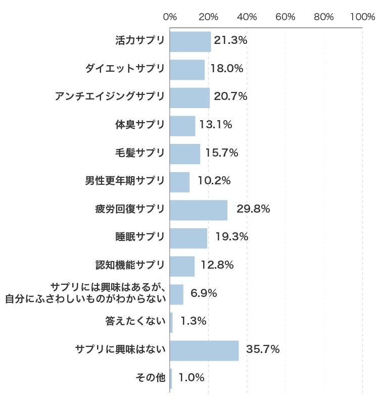 まず「興味のあるサプリメント」について複数選択で質問したところ、「疲労回復・元気」が最も多い回答となりました。アンチエイジングやダイエットといった見た目を意識したサプリメントにも相当数の男性が関心を示していることがわかります。