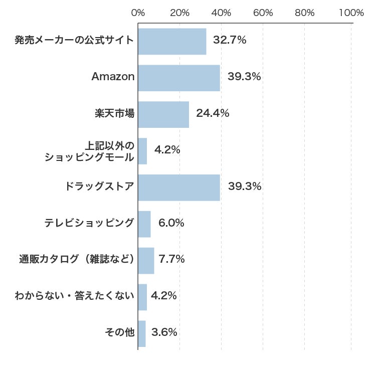 サプリメントの購入先として、「Amazon」と「ドラッグストア」が同率で最上位となり、次いで「メーカーの公式サイト」が続いています。実店舗とオンラインの両方が主要な購入チャネルとして活用されていることが示されました。
