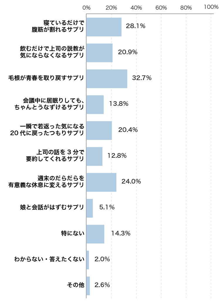 「理想のサプリ」についての自由回答では、「毛根が青春を取り戻す」「寝ているだけで腹筋が割れる」「週末を有意義に過ごせる」などプライベートに関する希望が多数を占めました。一方、「上司の説教を聞き流せる」「会議中に居眠りしても気づかれない」「上司の話を自動要約する」といった仕事関連の回答は予想外に少ない結果となったと報告されています。