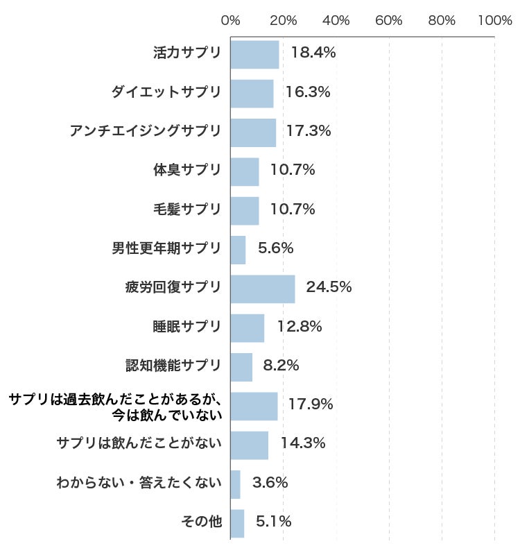「現在服用しているサプリメント」についても調査が行われ、こちらも「疲労回復・元気」が最上位となりました。また、ダイエット、アンチエイジング、体臭、毛髪、睡眠など様々な目的のサプリメントも、10~20%程度の男性が実際に利用していることが判明しています。