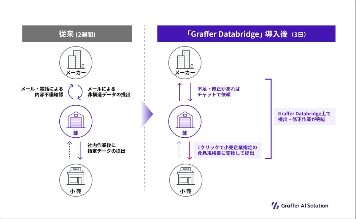 「Graffer Databridge」は、食品規格書を提出するメーカーと転記・集約する卸売企業の双方の業務効率化に貢献し、商流全体のデータ連携をスムーズにします。