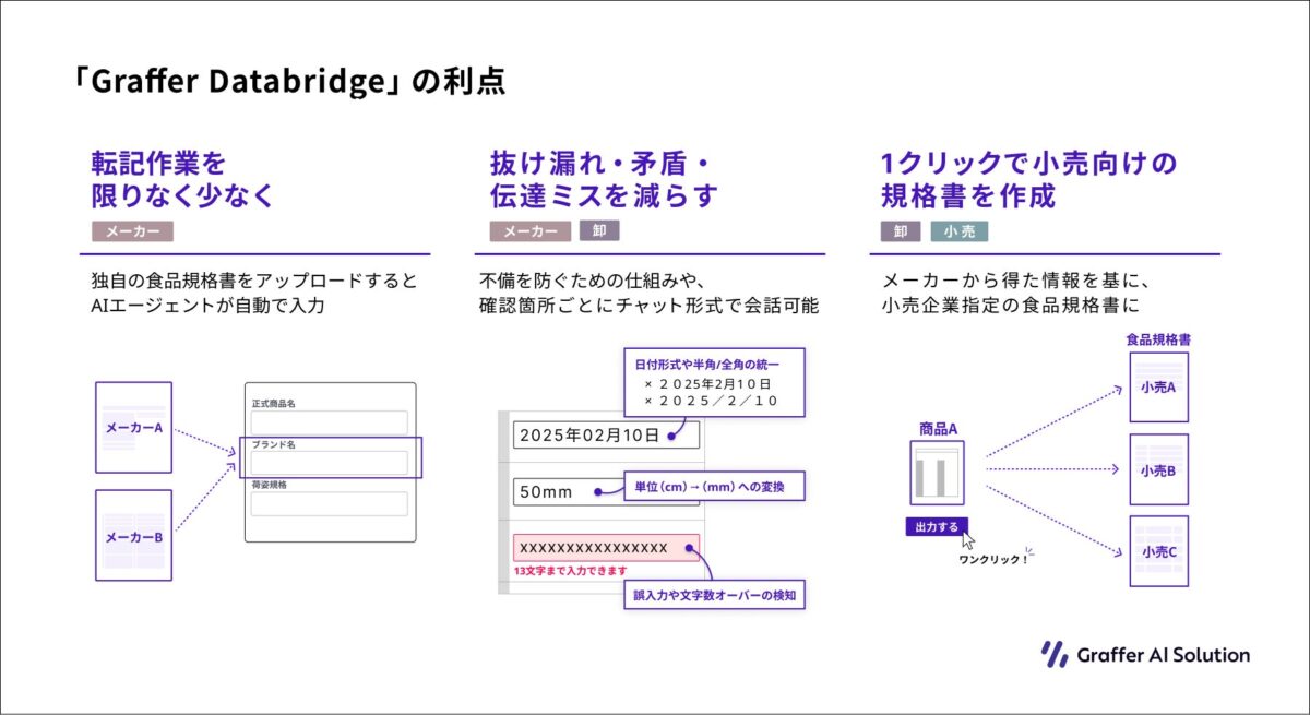 「Graffer Databridge」は、AIエージェントが企業間のデータ連携を高度化するサービスです。第一弾として、食品業界向けに提供が開始されます。