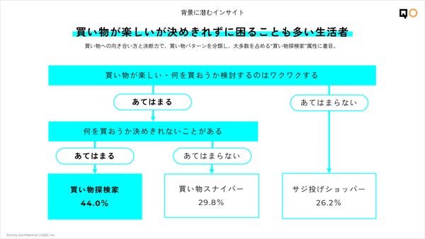 「昨今の情報量の多様化・増加により、購入そのものだけでなく、比較・発見・利用シミュレーションなどの検討過程を楽しむ生活者が増えています。一方で、選択肢が多すぎて迷ったり、比較が終わらなかったりと、購入決断の難しさは高まっているのではないでしょうか。それぞれのタイプに寄り添い、背中を押すことで、なかなか「購入」段階に進めなかった人のスムーズな決断を促すことができるのではないかと考えられます。」