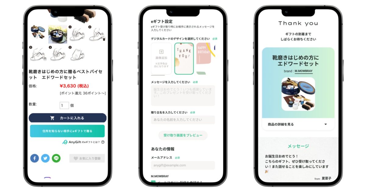 AnyGiftは、送り先の住所を知らなくてもLINEやメールを通じて贈り物ができる"eギフト機能"をECサイトに実装可能なサービスです。今回のAnyGift導入により、「M.MOWBRAY公式オンラインショップ」の人気商品をeギフトとして送ることができるようになりました。