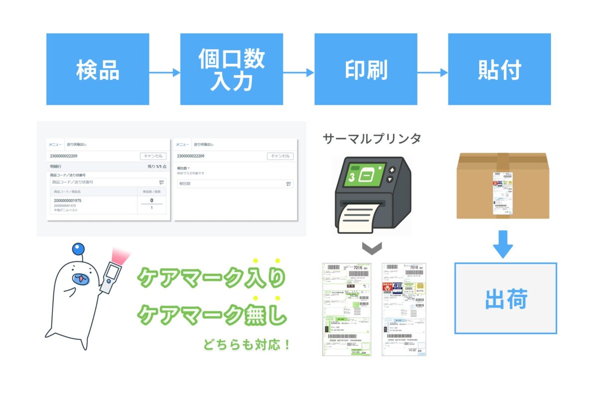 SKU数や商品サイズが多様で、梱包数の確定が商品を集めた後になる場合でも、サーマルプリンタを用いることで出荷伝票単位で迅速に発行できます。検品完了のタイミングで個数を指定して印刷ができるため、送り状の追加発行で発生していた手戻りや事務作業の工数が大幅に削減されるとのことです。