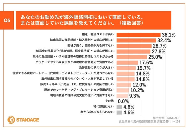 食品輸出企業の課題、物流コスト高が36.1%で最多 - スタンデージの海外販路開拓実態調査2025
