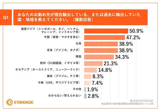 デジタル貿易プラットフォームを提供する株式会社STANDAGE(スタンデージ)は、食品業界の海外販路開拓に関する実態調査を実施しました。この調査では、国内で食品を海外輸出している企業や輸出経験がある企業で海外販路開拓業務に携わる108名を対象に、輸出の実態や課題を明らかにしています。