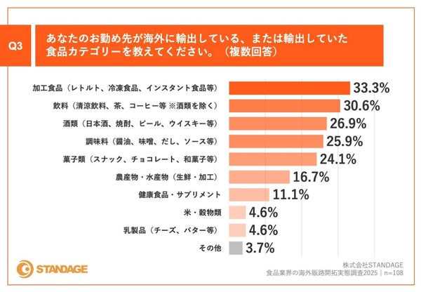 「あなたのお勤め先が海外に輸出している、または輸出していた食品カテゴリーを教えてください。(複数回答)」(n=108)という質問には、「加工食品(レトルト、冷凍食品、インスタント食品等)」が33.3%で最多となりました。続いて「飲料(清涼飲料、茶、コーヒー等 ※酒類を除く)」が30.6%、「酒類(日本酒、焼酎、ビール、ウイスキー等)」が26.9%という結果でした。