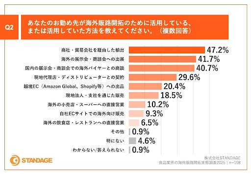 「あなたのお勤め先が海外販路開拓のために活用している、または活用していた方法を教えてください。(複数回答)」(n=108)という質問に対しては、「商社・貿易会社を経由した輸出」が47.2%で最も多く、次いで「海外の展示会・商談会への出展」が41.7%、「国内の展示会・商談会での海外バイヤーとの商談」が40.7%という結果になりました。