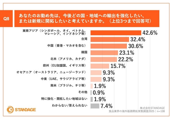 「あなたのお勤め先は、今後どの国・地域への輸出を強化したい、または新規に開拓したいと考えていますか。(上位3つまで回答可)」(n=108)という質問では、「東南アジア(シンガポール、タイ、ベトナム、マレーシア、インドネシア等)」が42.6%と最も高い回答率となりました。次いで「台湾」が32.4%、「中国(香港・マカオを含む)」が30.6%という結果でした。