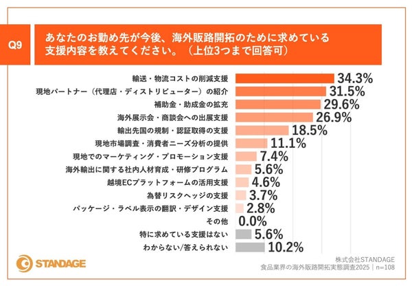 「あなたのお勤め先が今後、海外販路開拓のために求めている支援内容を教えてください。(上位3つまで回答可)」(n=108)という質問では、「輸送・物流コストの削減支援」が34.3%で最も多く、次いで「現地パートナー(代理店・ディストリビューター)の紹介」が31.5%という結果となりました。