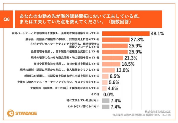「あなたのお勤め先が海外販路開拓において工夫している点、または工夫していた点を教えてください。(複数回答)」(n=108)という質問には、「現地パートナーとの信頼関係を重視し、長期的な関係構築を図っている」が48.1%と約半数の回答を得ました。続いて「展示会・商談会に継続的に参加し、認知度向上に努めている」が27.8%、「SNSやデジタルマーケティングを活用し、現地消費者に直接アプローチしている」が25.9%という結果でした。