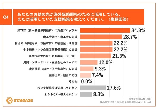 「あなたのお勤め先が海外販路開拓のために活用している、または活用していた支援施策を教えてください。(複数回答)」(n=108)という問いに対しては、「JETRO(日本貿易振興機構)の支援プログラム」が34.3%と最も高い回答率で、次いで「商工会議所・商工会の支援」が28.7%となりました。一方、17.6%の企業は「特に支援施策は活用していない」と回答しています。