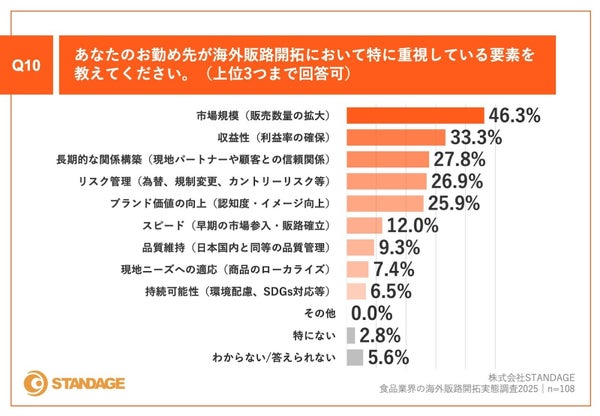 「あなたのお勤め先が海外販路開拓において特に重視している要素を教えてください。(上位3つまで回答可)」(n=108)という質問には、「市場規模(販売数量の拡大)」が46.3%と最も高い回答率となりました。続いて「収益性(利益率の確保)」が33.3%、「長期的な関係構築(現地パートナーや顧客との信頼関係)」が27.8%という結果でした。