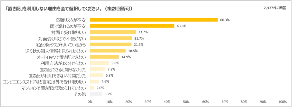 ヤマト運輸に限らず置き配を利用したことがない方の「置き配を利用しない理由」の1位は、2年連続で「盗難リスクが不安」(66.3%)でした。続いて「雨で濡れるのが不安」(43.8%)、「対面で受け取りたい」(23.7%)などの理由が挙げられています。