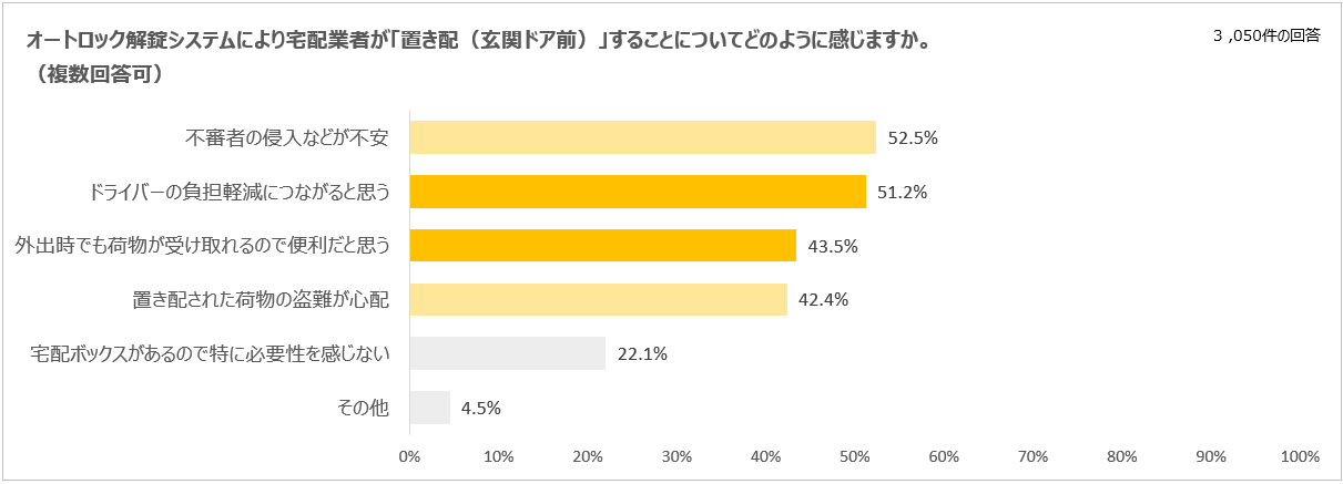 オートロック付きマンションにお住まいの方に、「オートロック解錠システムにより宅配業者が置き配(玄関ドア前)することについてどのように感じますか」という質問をした結果、「不審者の侵入などが不安」(52.5%)、「置き配された荷物の盗難が心配」(42.4%)などの懸念の声が半数程度寄せられました。