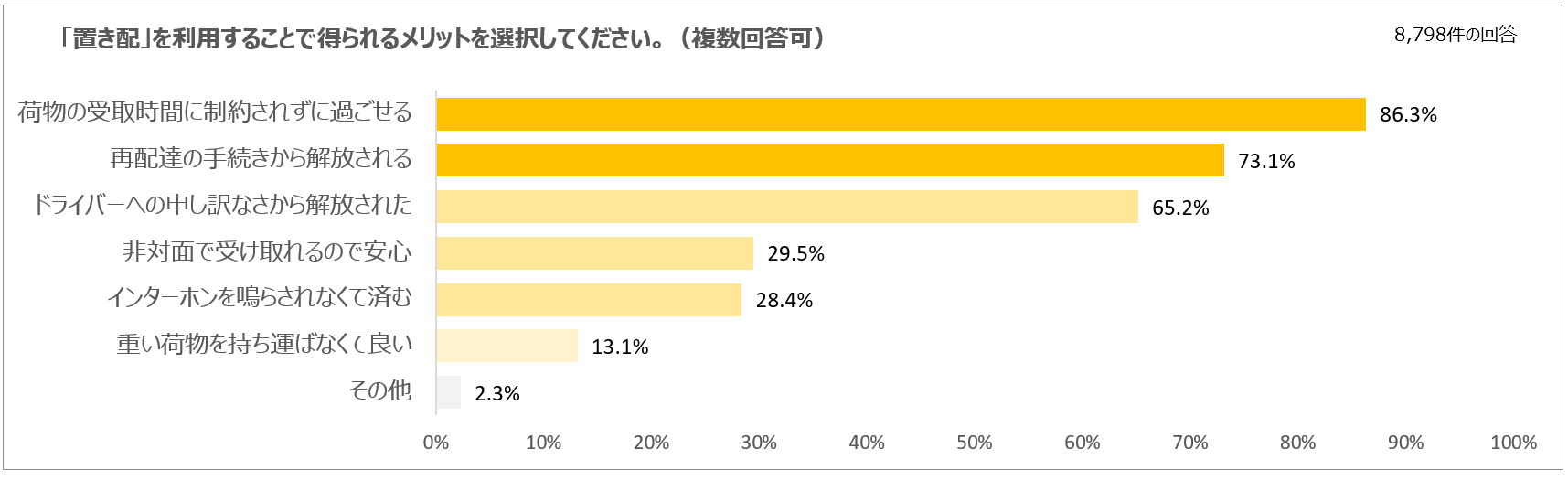 置き配を利用することで得られるメリットについて、「荷物の受取時間に制約されずに過ごせる」(86.3%)が最も高く、続いて「再配達の手続きから解放される」(73.1%)という結果でした。