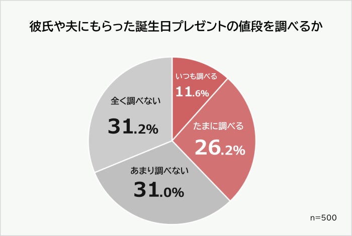 彼氏や夫に誕生日プレゼントをもらったとき、その値段を調べる女性は「いつも(11.6%)」「たまに(26.2%)」を合わせて37.8%という結果になりました。