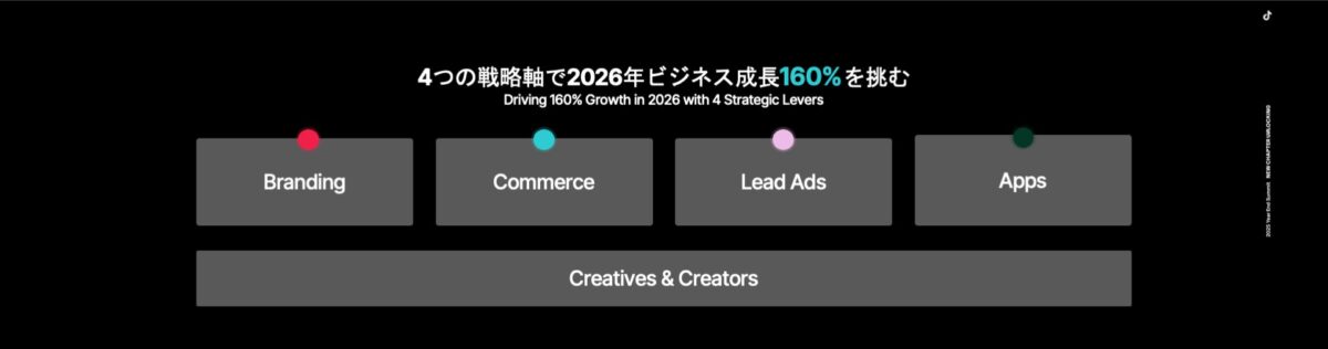 発表によれば、2026年に向けて、TikTok for Businessはブランディング、リード獲得、アプリ、eコマースという4つの戦略軸を中心に、クライアントのさらなるビジネス成長を支援する新たなソリューションを順次提供していく予定とのことです。また、メジャーメント領域(効果測定)においては、データクリーンルームなどを活用した測定精度の向上にも積極的に取り組んでいくことが示されています。