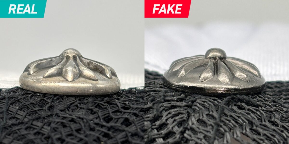 また、メッシュ部分については正規品と比べて柔らかく型崩れしているものが多く見られます。天ボタンに使用されるコンチョについても、偽造品ではメッキ素材のものが多く使用されており、光沢や加工の質感が正規品と異なっています。