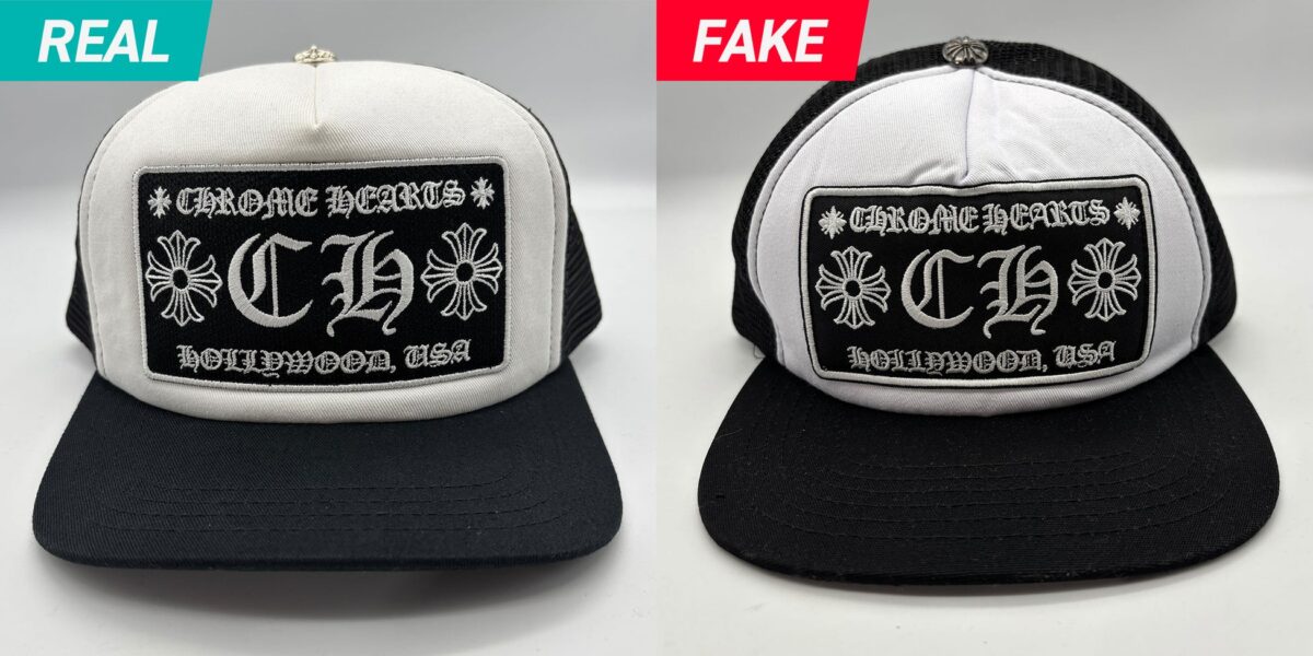 真贋ポイントとしては、偽造品ではツバやクラウンの形状が正規品と比較して歪んでおり、全体のバランスが取れていない特徴があります。