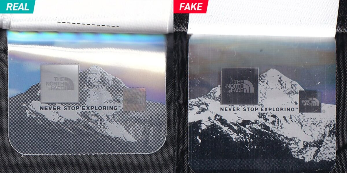 さらに、ハーフドームの刺繍の仕様にも相違点があります。「トラストネームタグ」は形状に明確な違いがあり、正規品が横長の形状なのに対し、偽造品は正方形に近い形状になっていることが特徴です。加工の精度も正規品より劣り、雪山の雪の表現量が多いのも偽造品を見分けるポイントとなります。