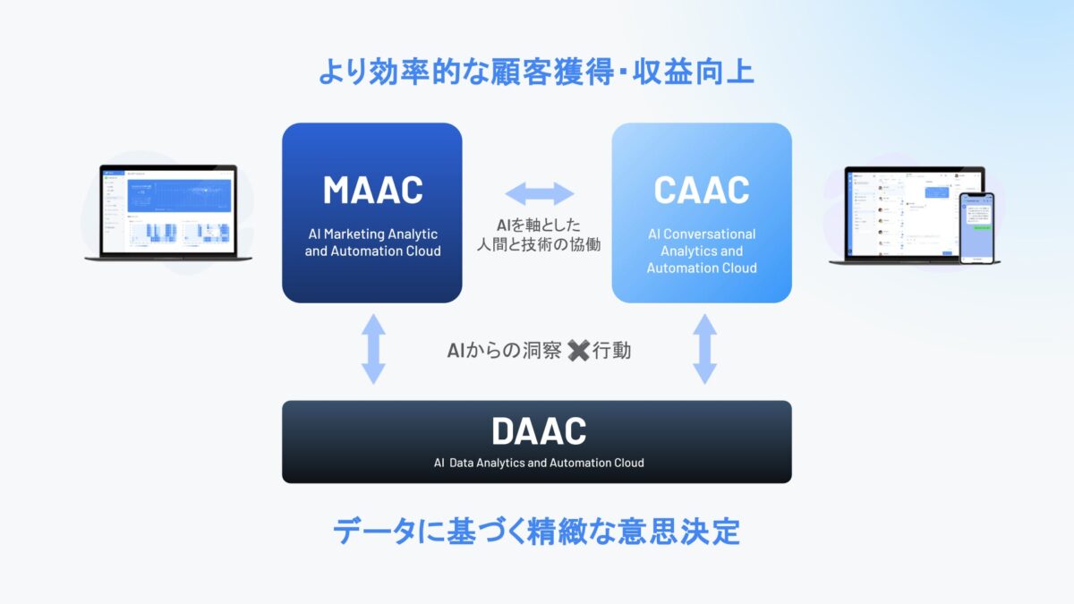 クレッシェンドラボは、日本市場において2022年からAIを活用したマーケティング基盤「MAAC(マーク)」と「CAAC(カーク)」を展開しています。MAACは、LINEやSMSで1対複数のパーソナライズコミュニケーションを実現するプラットフォームであり、CAACは、1対1のセールス/サポートを効率化させるプラットフォームとなっています。
