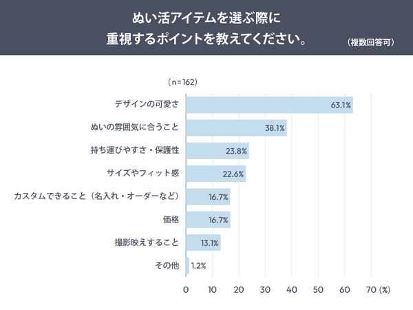 ぬい活関連のアイテムを選ぶ際に最も重視される点について調査したところ、「デザインの可愛さ」が63.1%と最も高い結果となったことがわかりました。次いで「ぬいの雰囲気に合うこと」(38.1%)、「持ち運びやすさ・保護性」(23.8%)という順になっています。