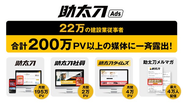 株式会社助太刀が運営する複数のメディアに同時に掲載されることで、ユーザーとの接触機会を大幅に拡大し、多角的なアプローチを実現します。同社が運営する複数の建設業従事者専門メディアに同時掲載されることで、効果的な広告展開が可能になります。