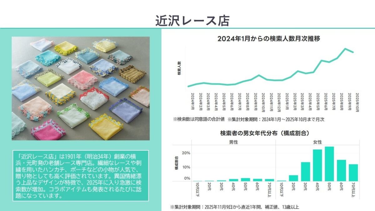 「近沢レース店」は1901年(明治34年)創業の横浜・元町発の老舗レース専門店です。繊細なレースや刺繍を用いたハンカチ、ポーチなどの小物が人気で、贈り物としても高く評価されています。異国情緒漂う上品なデザインが特徴で、2025年に入り急激に検索数が増加しており、コラボアイテムも発表されるたびに話題になっていることが報告されています。