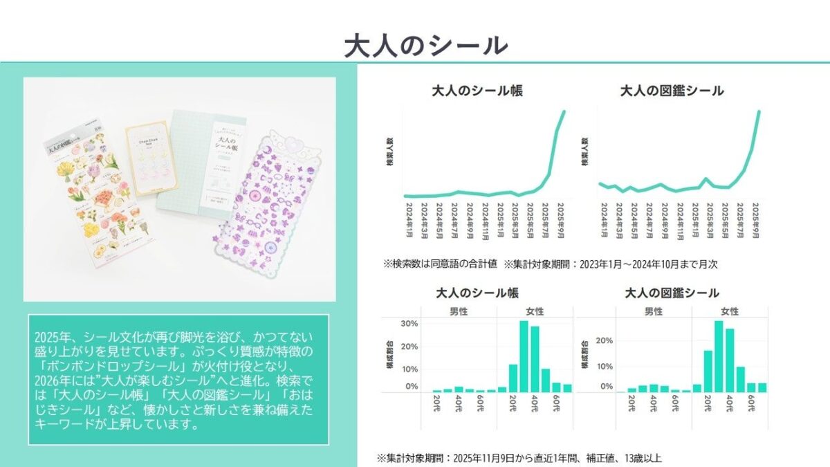 2025年、シール文化が再び脚光を浴び、かつてない盛り上がりを見せているとのことです。ぷっくり質感が特徴の「ボンボンドロップシール」が火付け役となり、2026年には"大人が楽しむシール"へと進化していくことが予測されています。検索では「大人のシール帳」「大人の図鑑シール」「おはじきシール」など、懐かしさと新しさを兼ね備えたキーワードが上昇しているようです。