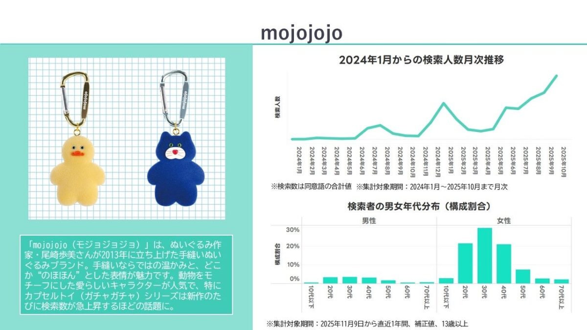 「mojojojo(モジョジョジョ)」は、ぬいぐるみ作家・尾崎歩美さんが2013年に立ち上げた手縫いぬいぐるみブランドです。手縫いならではの温かみと、どこか"のほほん"とした表情が魅力となっています。動物をモチーフにした愛らしいキャラクターが人気で、特にカプセルトイシリーズは新作のたびに検索数が急上昇するほど話題になっていることが報告されています。
